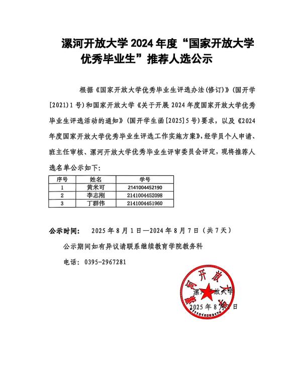 漯河开放大学2024年度”国家开放大学优秀毕业生”推荐人选公示