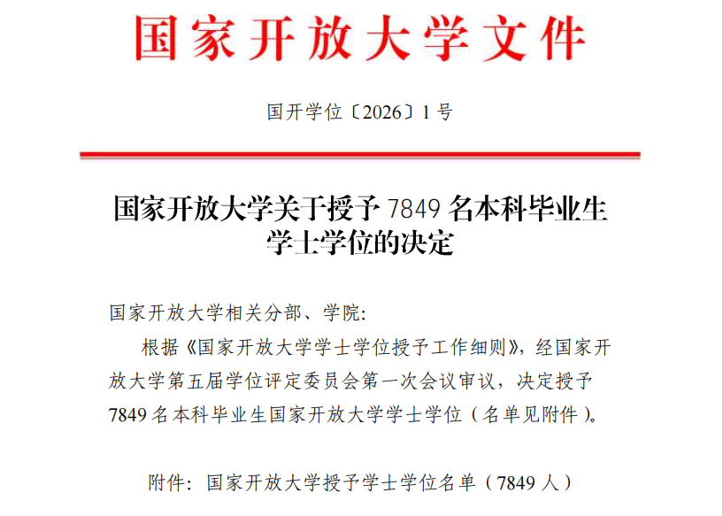 近日,国家开放大学正式发布《关于授予7849名本科毕业生学士学位的决定》(国开学位〔2026〕1号)。漯河开放大学在本年度学士学位申报中共有4名学生提出申请,其中王子韬、王志勇、典斐斐等3人顺利通过审核,成功获得国家开放大学学士学位,通过率达75%。