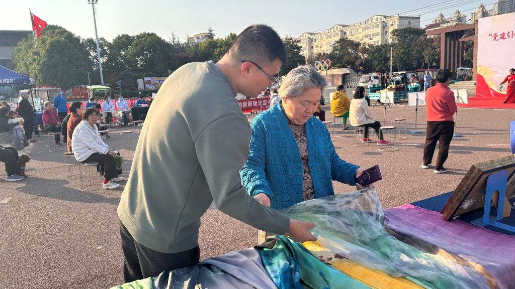活动中,社区大学的老师将夜校项目中的作品进行了展示,珠绣作品熠熠生辉,蜡染、扎染布艺散发着独特的民族韵味......,这些丰富多彩的终身学习课程吸引了大量社区居民驻足咨询,表现出浓厚兴趣。